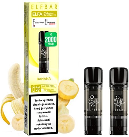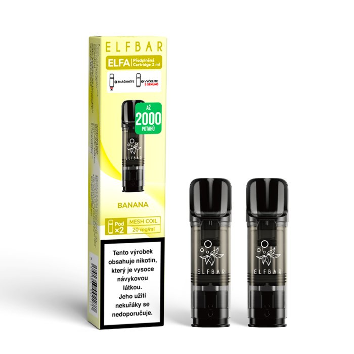 Elf Bar ELFA Pods cartridge 2Pack Banana 20mg – dokonalá kombinace zralého banánu a jemné krémové dochuti. Předplněné cartridge s 2ml liquidu a 20mg nikotinové soli pro rychlé a kvalitní vstřebávání bez dráždivého pocitu v krku.