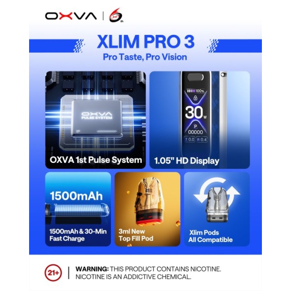 Elektronická cigareta OXVA Xlim Pro 3 s baterií 1500mAh a rychlým USB-C nabíjením nabízí špičkovou chuť a univerzální použití pro MTL i RDL. Ideální volba pro začátečníky i pokročilé vapery.