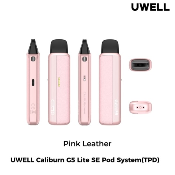 Elegantní Uwell Caliburn G5 Lite SE Pod vape s kapacitou baterie 1600mAh a výkonem až 35W. Stylový design v růžové kůži a technologie PRO-FOCS 4.0 pro čistou chuť.